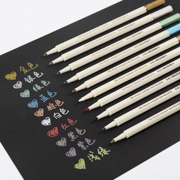 Envoyer une demande【Couleurs éclatantes et scintillantes】10 couleurs métalliques éclatantes pour une écriture et une décoration opaques, notamment sur papier noir : or, argent, marron, bleu, rose, blanc, noir, violet, vert et olive. Chaque couleur métallique contient des encres légèrement chatoyantes et de fines particules qui ajoutent une touche de créativité et de fun. Grâce à leur éclat métallique, les polices et les marqueurs s'exprimeront et marqueront vos albums photo, livres d'or de mariage, albums de scrapbooking, cartons et calendriers familiaux.